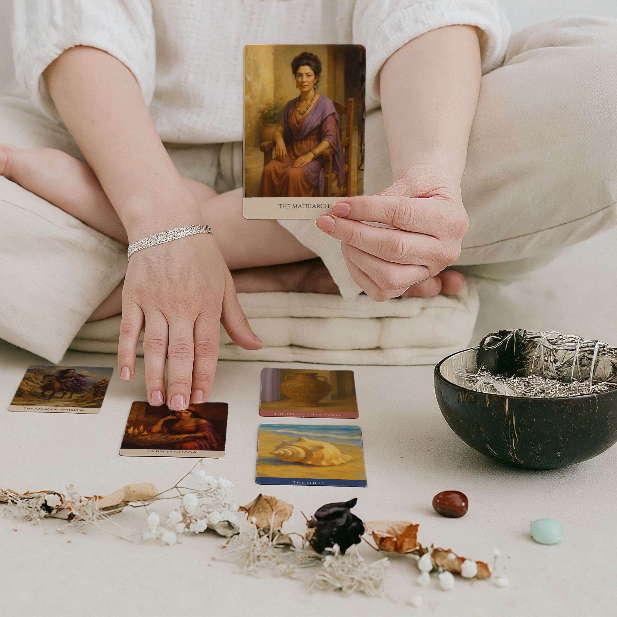 This 40-card deck brings together Mediterranean feminine archetypes, ancient symbols, and elemental forces, designed as a grounded tool to help you pause, reflect, and return to yourself.